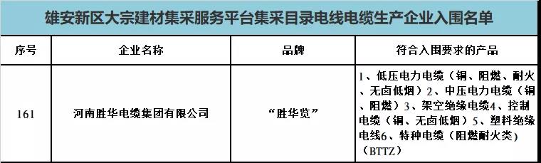 热烈祝贺河南胜华电缆集团入围雄安新区大宗建材集采目录-胜华电缆集团有限公司